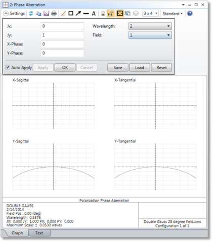 Polarization phase aberrations are induced by the effects of refraction through dielectric media, and by reflection from metallic or dielectric mirrors. This feature computes for the specified field position and wavelength the polarization phase aberration in the image space for the X and Y orientations of the electric field vector as a function of entrance pupil coordinate. The aberration is defined as the variation in the phase of the electric field in one direction, such as X or Y, as a function of the pupil position. For example, if the electric field in the X direction is (0.7 + 0.7i) for the chief ray (note the E field values are complex), and at some other point in the pupil the electric field in the X direction is (-0.7 + 0.7i) then the polarization phase aberration between these points is one-quarter wave (the phase of Ex changed from 45 degrees to 135 degrees, or one-quarter wave). Note this is completely distinct from the phase differences between the Ex and Ey fields, which describe the polarization state (linear or circular for example). For phase differences between Ex and Ey see " Power Pupil Map ".