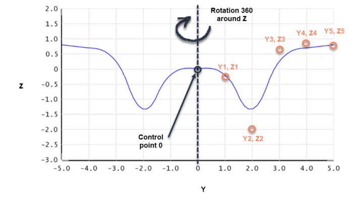 The radial NURBS surface is defined by a series of weighted control points. The control points define a curve which starts at the origin and lies in the YZ plane along the +Y direction. Once this curve is defined, a figure of revolution is formed by rotating the curve a full 360 degrees around the Z axis. Unlike a spline surface, a NURBS curve does not actually go through the control points, except for the first and last control points. This can be seen in the example below.