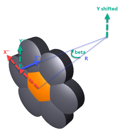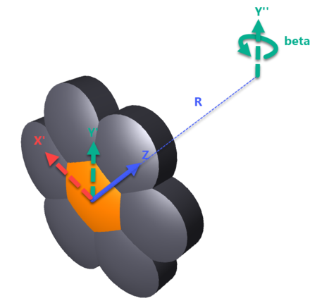 つづいて、アレイのローカル座標の Y 軸に平行で、アレイのローカル +Z 方向に距離 R だけ移動した軸を中心として、そのオブジェクトが角度βだけ回転します。この操作により、アレイ エレメントのローカル座標 Z が半径 R の球の中心方向を指すようになります (R が負の場合は中心から離れる方向を指します)。ここで使用する角度βの符号規則により、R が正負のどちらであるかにかかわらず、βは必ず正になり、オブジェクトは必ずローカル座標の +X 軸方向に回転します。