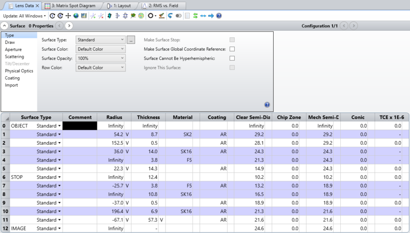 レンズ データ エディタ上部の [面のプロパティ] (Surface Properties) バーの下矢印をクリックすると、 [面のプロパティ] (Surface Properties) ダイアログ ボックスが展開されます。 ダイアログ ボックスに表示される [面のプロパティ] (Surface Properties) は、レンズ データ エディタで別の面をクリックするか、[面のプロパティ] (Surface Properties) バーの左/右矢印をクリックすることで変更できます。 このダイアログ ボックスでは、次の面のプロパティを定義できます。