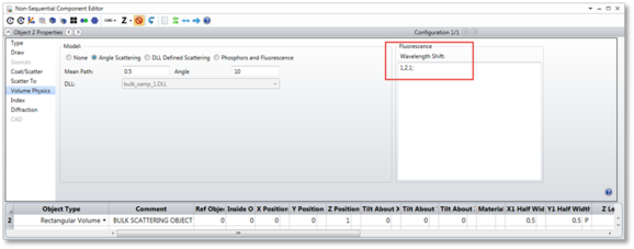 [波長シフト] (Wavelength Shift) コントロールによって、バルク散乱発生時の波長遷移を定義できます。この機能は、おもに蛍光をモデル化するときに使用します。光線がバルク散乱できる回数を制御する方法については、「[オブジェクト プロパティ] (Object Properties)」の「[光源] (Sources)」のセクションを参照してください。