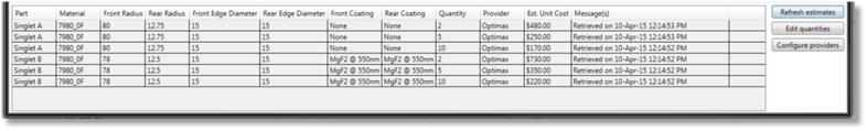 刷新估算值(Refresh estimates) - 将镜头信息提交给成本估算器供应商,并显示返回的结果。