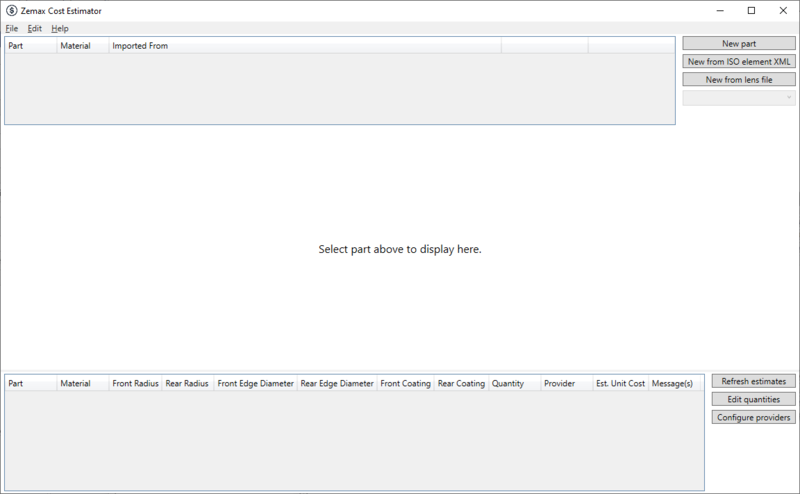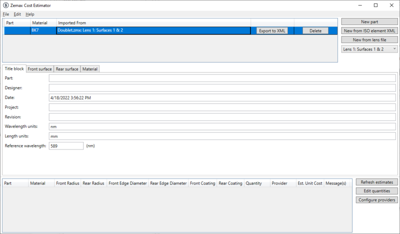 将您的工作保存在成本估算器中,以便以后继续使用或与其他OpticStudio用户共享,请从主菜单中选择"文件 > 保存成本估算项目"或"文件 > 将成本估算项目另存为"。然后,您可以从另一个成本估算器会话中使用主菜单中的"文件 > 打开成本估算器项目"打开成本估算器项目文件。此项目文件保存您输入的所有镜头数据以及最近检索的成本估算值。