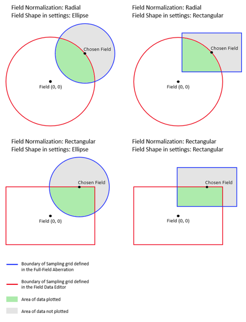 注意,不对落在视场数据编辑器定义的归一化视场边界之外的采样点数据进行绘制。下面是以"指定视场"点为中心的全视场像差图的示例。