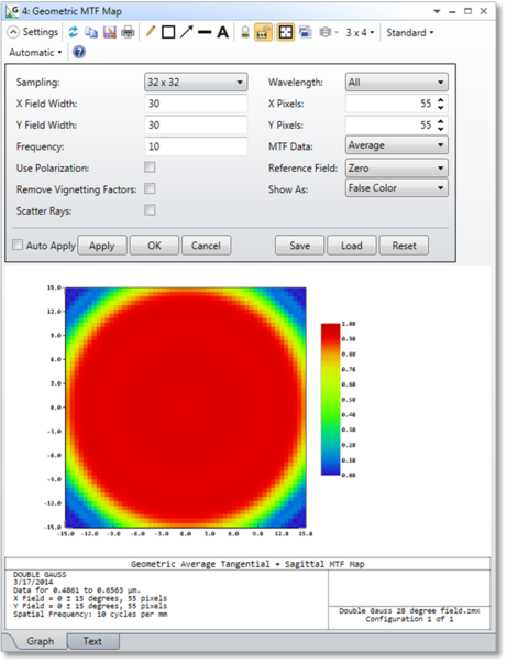 详述(Discussion) 请参阅"几何MTF(Geometric MTF)"以了解详细信息。此功能可计算二维网格上每个视场点的GMTF。如果总点数较大,则计算时间可能会很长。参见"FFT MTF图(FFT MTF Map)"。