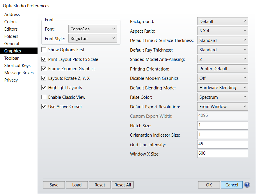 OpticStudio配置选项(OpticStudio preferences)窗口中可以进行图形(Graphics)设置,该窗口可以通过设置选项卡(Setup Tab)的系统(System)部分中的按钮来显示。这些设置决定了OpticStudio大部分图形窗口的大小、颜色和动作。