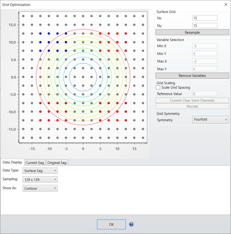对称(Symmetry):网格对称(Grid Symmetry)是指在优化过程中保持网格点的对称。网格对称包含4个选项。无(None)、左右对称(Left-Right)、上下对称(Up-Down)、四重对称(Fourfold)。选择网格对称后,对称点将显示为红色。