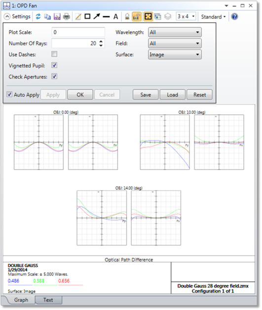 垂直轴比例尺在图形底部给出。标绘的数据为光程差,它是光线的光程和主光线光程的差值。一般情况下,此计算也会回溯引用到系统出瞳位置处光程之间的差值。如需了解更多信息,请参见OPD参考(Reference OPD)。每个图形的水平比例尺都是归一化的入瞳坐标。