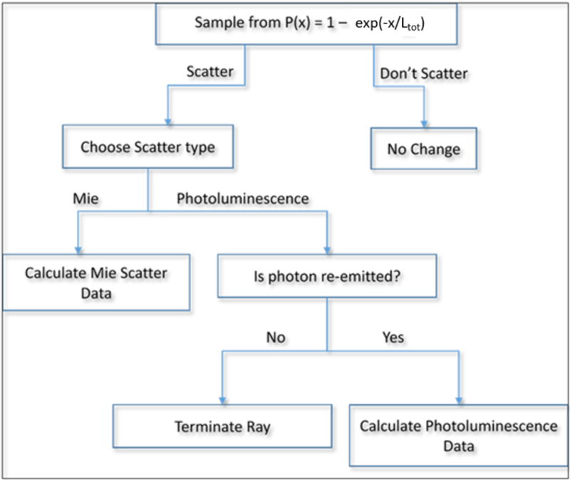 Ltot是总的平均自由程,LMie是Mie平均自由程,LPL是光致发光平均自由程。通过一个在0和1之间均匀分布的随机数r来得到散射类型。如果r < Ltot/ LPL,则光线进行光致发光。否则进行Mie散射。如果输入波长的量子效率不为零,则光子重新发射。在这种情况下,从发射光谱中得到波长概率。否则,通过非辐射通道光子损失。在这种情况下,光线被终止。