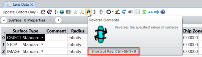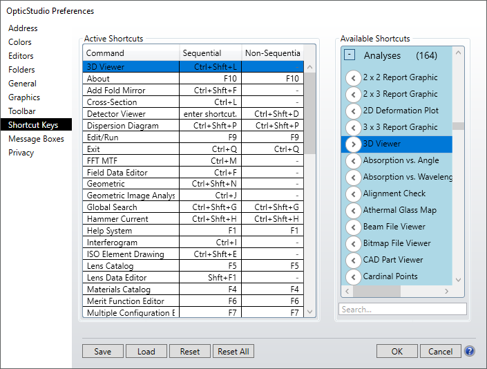 在OpticStudio配置选项( OpticStudio Preferences)窗口中可以进行快捷键(Shortcut Keys)设置,该窗口可以通过设置选项卡(Setup Tab)的系统(System)部分中的按钮来显示。此设置可以让用户查找并自定义快捷键。