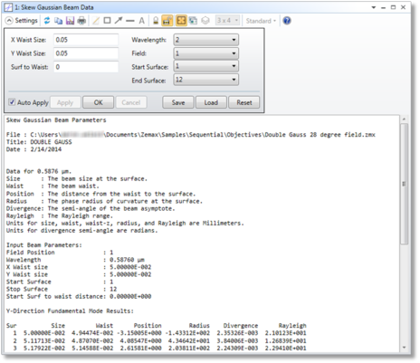 光束最初根据起始面之前的光学空间中X和Y方向的束腰尺寸进行定义。视场和波长设置可用来定义通过光学系统追迹的主光线。此主光线在整个传播过程中是倾斜高斯光束的轴。