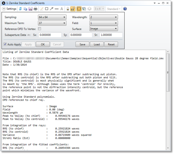 计算使用下文中定义的表示法计算的正交Zernike系数:请参阅R. Noll"Zernike polynomials and atmospheric turbulence", J. Opt.Soc.Am., Vol. 66, No. 3, p207 (1976)。该表示法允许将项数统一定义为(几乎)任意阶项数,而非有限的37项Fringe多项式。该系数采用光波单位提供。