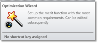 The Optimization Wizard is available in the Automatic Optimization section of the Optimize tab, or by expanding the bar labeled "Wizards and Operands" above the Merit Function Editor data. The Optimization Wizard displays a dialog box which allows selection of the merit function type and relative ray density.