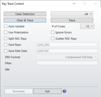Clear & Trace Clears the detectors selected and begins tracing rays. See the Clear Detector and Trace settings for details.