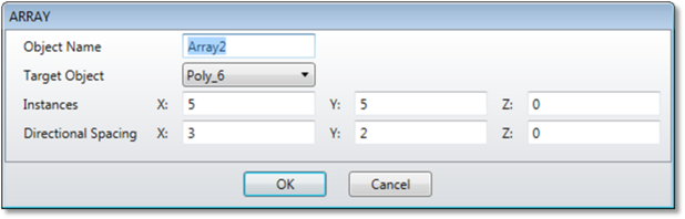 Creates an array of the geometry defined by object. The geometry defined by the named object is replicated nx, ny, and nz times with a spacing of dx, dy, and dz. The array is always centered in the coordinate system, whether the n value are even or odd. Note this command creates a new object from object1 and the original object is unaltered. Arrays cannot be created if they consist of over 200 individual objects; This means nx * ny * nz may not exceed 200.