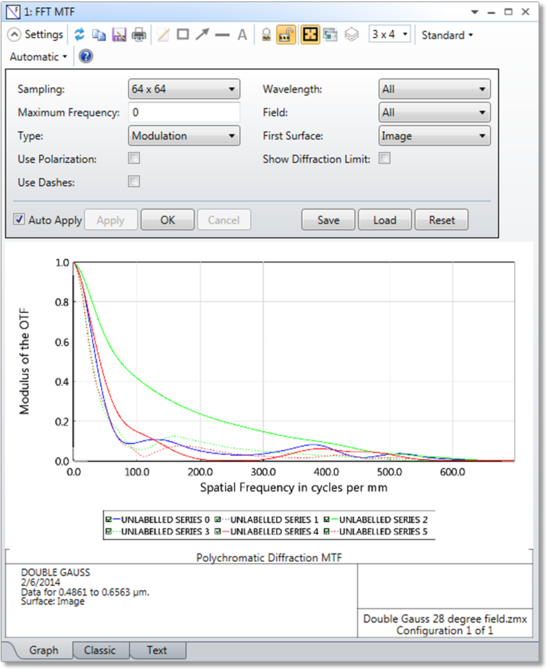 When the OPD in waves is large, such as more than 10 waves, it is probably a good idea to switch to geometric MTF instead of diffraction MTF. For these highly aberrated systems, the geometric MTF is very accurate, especially at low spatial frequencies (the higher frequency MTF falls off rapidly when aberrations are large). If shown, the diffraction limit curve is for the aberration free response at the reference field position; see "Diffraction limited".