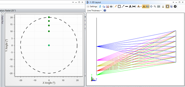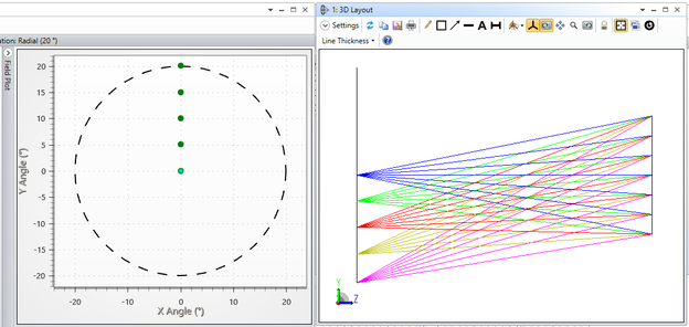 When "Field Type" is chosen as "Angle", field points are computed according to "Field Angles and Heights". Therefore, a field point that is not on the X or Y axis will have a different angle of incidence than an on-axis field point, and this deformation is taken into account in the calculation.Please note that this property will not be able to be calculated accurately when the max field is greater than 90 °.