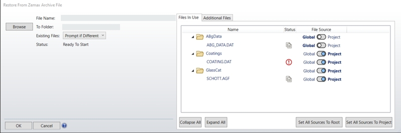 Files In Use Tab shows the files used by the lens project and are directly employed by OpticStudio to perform related activities such as extracting glass properties. When restoring the ZPRJ archive, files in use that have their file source set as "Project" will be saved in this folder. Files with their file source set as "Root" will be saved as defined by the OpticStudio Folders options.