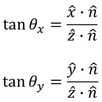 where θx and θy are tilt angles X and Y, n is the normal vector of the front or rear face, x, y, z are the unit vectors of local XYZ axes of the Rectangular Volume object.