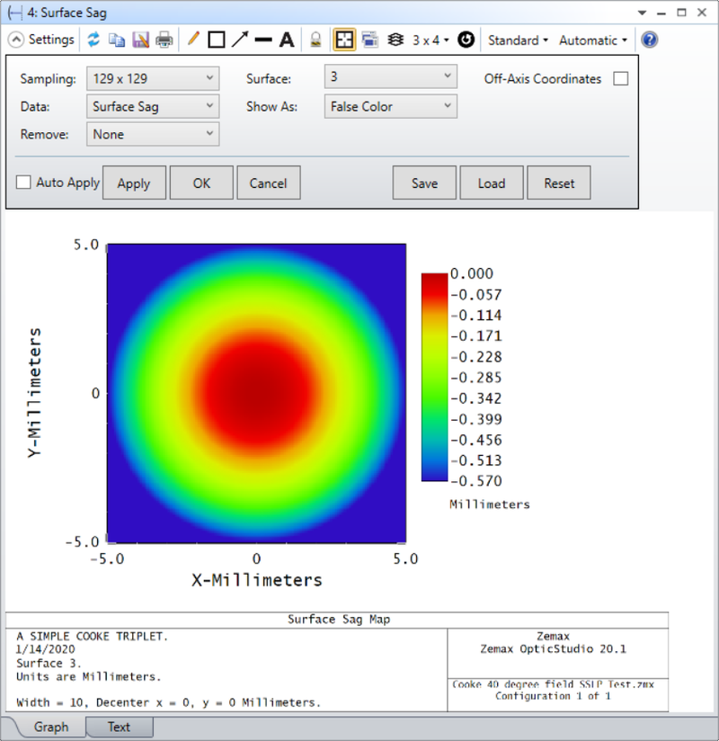 Discussion:This feature accounts for the size and shape of any aperture present on the surface; even if the aperture is decentered. The sag is computed on a uniform grid of points in XY plane, and the Z value of the sag is the displayed data.