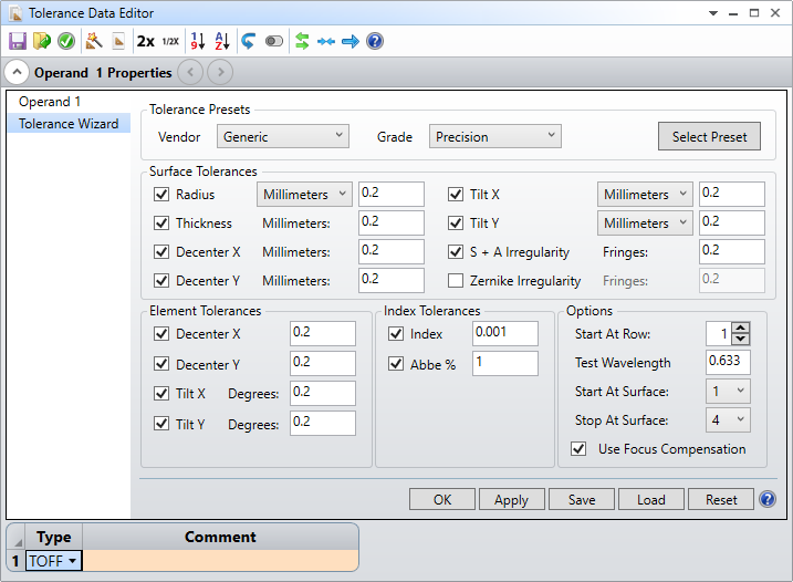 Radius: If this box is checked, then the default radius tolerances will be included. The default tolerances may be specified by a fixed distance in lens units, a percentage of the nominal radius or by fringes of power at the test wavelength (defined by the TWAV operand). This tolerance is only placed on surfaces which have optical power, which excludes dummy surfaces which have the same index on both sides. If the surface is plano, then the default tolerance is specified as a variation in fringes, even if another option is selected.