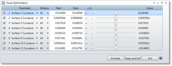 The visual optimization dialog supports between 1 and 8 individual slider controls. Each slider control may be used to interactively modify any defined variable value. Note the variable status of each value must be set prior to invoking the visual optimization control.