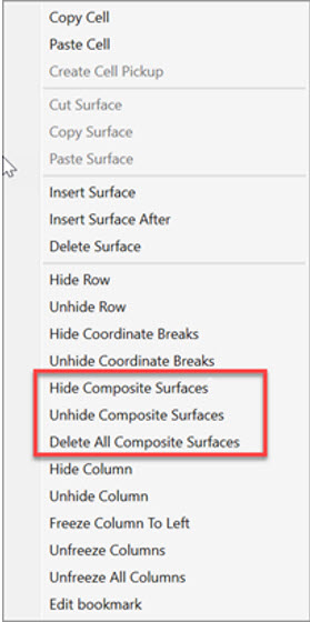 为了避免让镜头数据编辑器看起来很杂乱,可以在镜头数据编辑器的右键菜单中选择删除、隐藏或取消隐藏复合组件面。