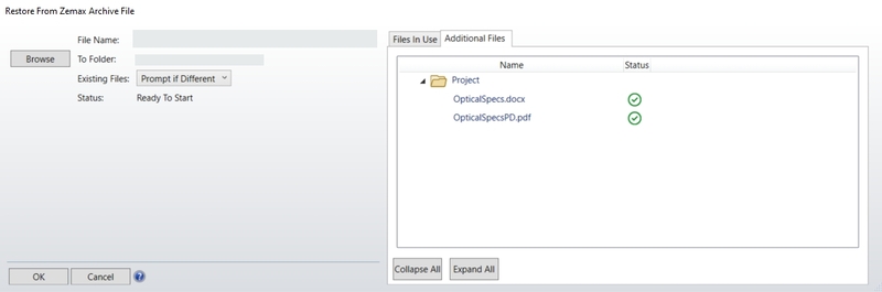 该功能加载先前创建的存档文件,并支持ZAR和ZPRJ存档格式。根据文件格式,OpticStudio将打开处理ZAR或ZPRJ的定制对话框。当选择该功能后,OpticStudio会提示您选择要恢复的文件。