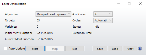 退出(Exit) 关闭局部优化对话框。优化运行时未启用退出。启用后,选择退出将导致对话框关闭,系统将更新为优化的当前值。