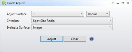 快速调整(Quick Adjust)按钮在优化选项卡(Optimize Tab)的手动调整组(Manual Adjustment)部分。调整任何一个面的半径或厚度,以在后续任意面上达到最佳的垂轴或角光线聚焦。参阅"快速聚焦(Quick Focus)"。