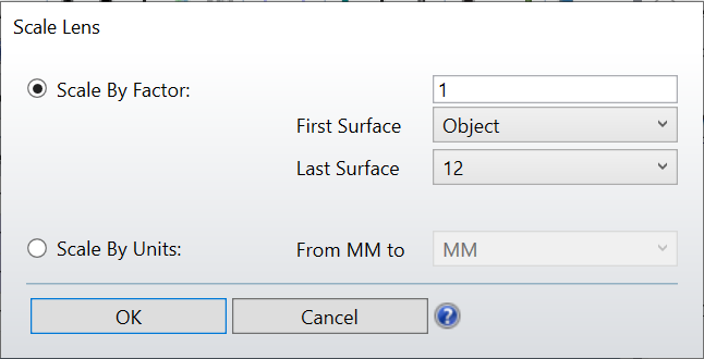 此功能可按一定的因子缩放整个镜头。例如,这对于将一个现成的设计缩放成一个有新焦距的设计很有用。波长不会缩放。缩放镜头功能也可以用于将单位由毫米转换成英寸,或其它组合的单位类型。