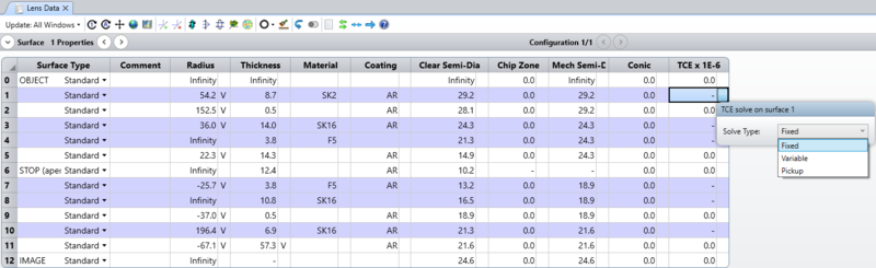 Contents 设置选项卡(The Setup Tab) » 编辑器组(设置选项卡)(Editors Group (Setup Tab)) » 镜头数据编辑器(Lens Data Editor) » 求解类型(镜头数据编辑器)(Solve Types (lens data editor)) » TCE求解(TCE Solve)Print page TCE求解(TCE Solve) 拾取(Pickup) TCE拾取求解使用其它表面的值作为目标表面的TCE值。另请参阅"求解限制(Solve restrictions)"。 下一部分: 参数求解(Parameter Solves) « 圆锥系数求解(Conic Solves)参数求解(Parameter Solves) »