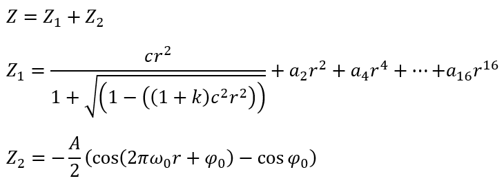 | US_EAPERIODIC | 此表面类似于偶次非球面,不过它含有一个附加项,描述矢高按正弦变化。这类变体非常适用于对不规则表面进行建模。表面的完整矢高表达式由以下公式给出: 这里,参数c、k与 |