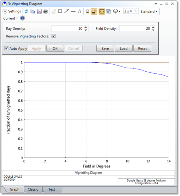详述(Discussion) 渐晕分数是指所有穿过系统遮阑和孔径入射到入瞳并到达像面的光线的百分比,归一化至相对光瞳面积。该功能生成的图形按视场位置函数显示渐晕分数。如果使用的光线过少,则结果可能不准确。在具有许多孔径和较大视场角的系统中,尤其如此。