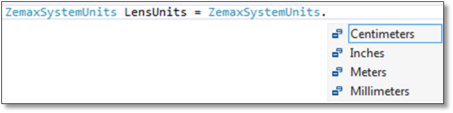 Contents 编程选项卡(The Programming Tab) » 关于ZOS-API(About the ZOS-API) » ISystemData TheSystemData » ISDUnitsData单位(ISDUnitsData Units) » ZemaxSystemUnits LensUnitsPrint page ZemaxSystemUnits LensUnits 镜头单位。这些单位适用于OpticStudio中如半径、厚度、入瞳直径、非序列模式位置坐标和大多数其它参数等数据。 下一部分: ZemaxUnitPrefix SourceUnitPrefix « ISDUnitsData单位(ISDUnitsData Units)ZemaxUnitPrefix SourceUnitPrefix »