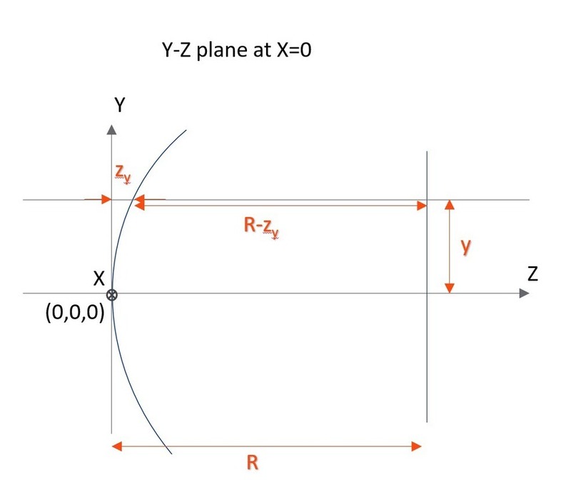 This curve is similar to the even aspheric surface sag formula, except the sixteenth order term has been omitted, and the coordinate argument is y, not r. This curve is then rotated about an axis a distance R from the vertex. This distance R is referred to as the radius of rotation, and may be positive or negative. The Y-Z radius of curvature is specified in the same column on the spreadsheet editor as the radius for Standard surfaces. The radius of rotation is set on parameter column number 1. To model a cylinder lens which is flat in the X direction use zero, which OpticStudio interprets as infinite radius.
