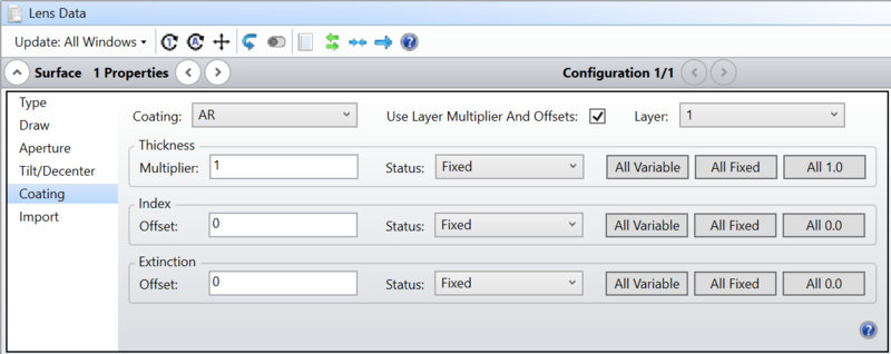 Use Layer Multipliers If unchecked, all coating layer multipliers are disabled for this surface. The coating thickness will be as defined by the coating data file. If checked, the coating multipliers are considered.