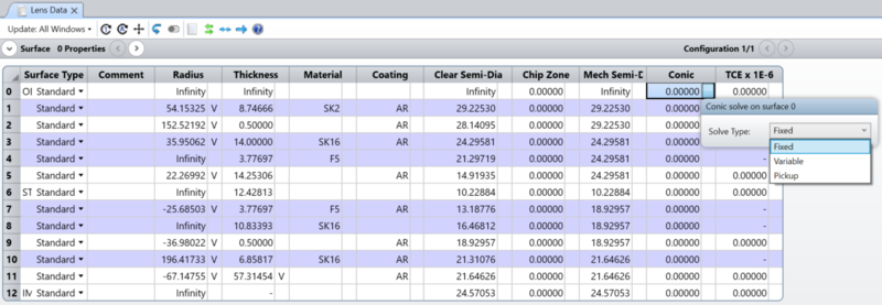 The conic pickup solve uses a scaled value from another surface and column as the conic on the target surface. See also "Solve restrictions".