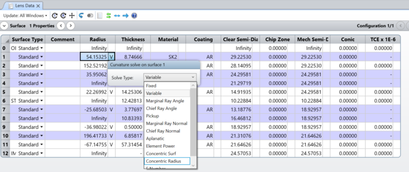 This solve will force the curvature of the surface such that the marginal ray angle exiting the surface is -1/2F where F is the paraxial F/#. The letter "F" will appear in the cell to indicate that the F/# solve is active on that surface.
