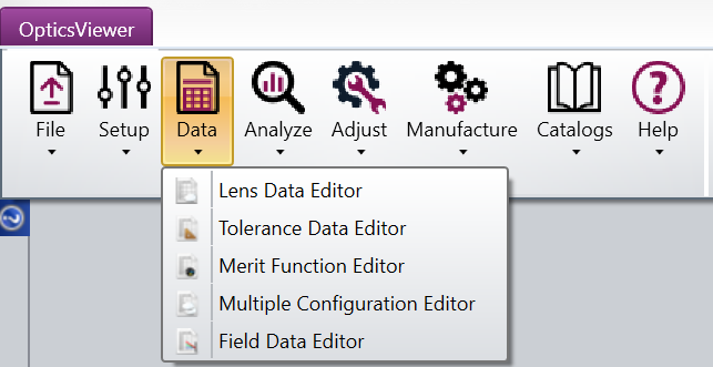 Lens Data Editor: Opens the Lens Data Editor window. It is the primary spreadsheet where the majority of the lens data will be entered. This data includes the radius of curvature, thickness, and glass for each surface in the system. See also Lens Data Editor.