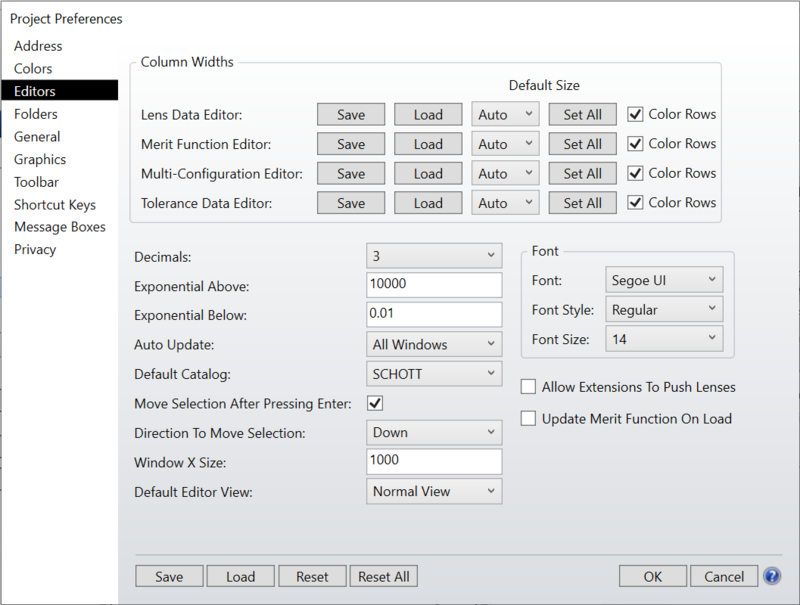Font Choose the Font, Style, and Size for the editor displays. To change the text in the graphics based analysis windows see the "Graphics" section of the OpticStudio Preferences. To change the text displayed in the text based analysis windows see the "General" section of the OpticStudio Preferences.