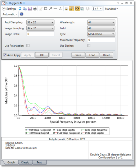 The Huygens MTF computes an FFT of the Huygens PSF. The settings for Image Sampling and Image Delta are the same as for the Huygens PSF, therefore it is instructive to do a Huygens PSF first (see "Huygens PSF"). Since the transform is done on the PSF in image space coordinates, the tangential response corresponds to spatial frequencies in the y direction in local image surface coordinates, and the sagittal response corresponds to spatial frequencies in the x direction. The Huygens MTF also has no dependence on the location of rays in the paraxial pupils. The MTF can therefore be computed for any system that the Huygens PSF can be computed for including many non-sequential systems using ports where reference rays required by other diffraction algorithms would not make it through, or for systems where pupils or images formed by multiple non- sequential sub-apertures are overlapped. Systems with extreme exit pupil distortion, such as very fast off-axis reflectors, are also handled correctly with the Huygens technique.