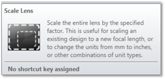 This feature will scale the entire lens by the specified factor. This is useful for scaling an existing design to a new focal length, for example. Wavelengths are not scaled. The scale lens feature may also be used to change the units from mm to inches, or other combinations of unit types.