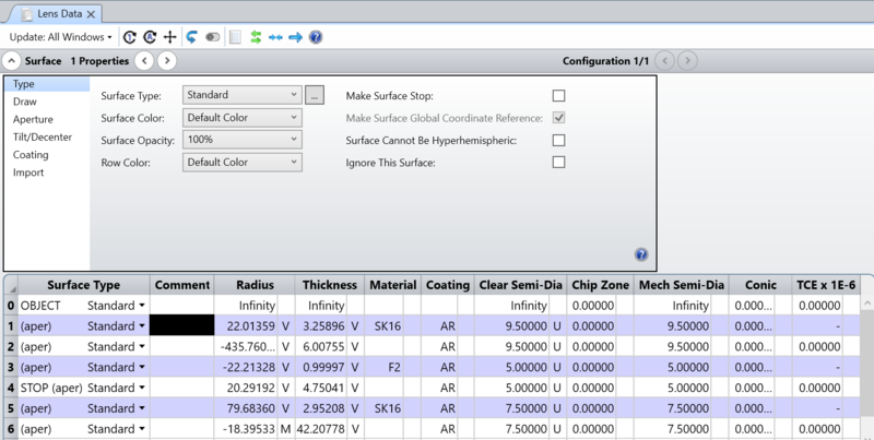 Clicking the down arrow in the Surface Properties bar above the Lens Data Editor will expand the Surface Properties dialog box. The Surface Properties shown in the dialog box can be changed by clicking on a different surface in the Lens Data Editor, or by clicking the left/right arrows in the Surface Properties bar. The following surface properties may be defined in this dialog box.