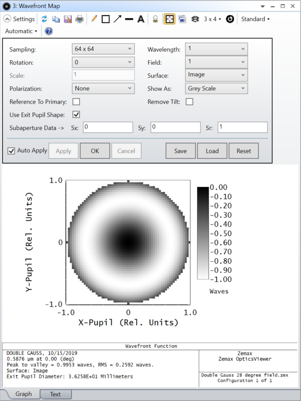Sampling The size of the ray grid used to sample the pupil. The sampling may be 32x32, 64x64, etc. Although higher sampling yields more accurate data, calculation times increase.