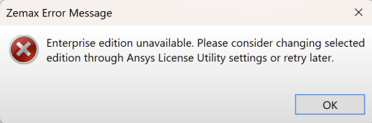 The user can select whether to use a Pro, Premium or Enterprise edition from the drop-down menu. Enterprise edition is selected by default. Once done, click OK and restart OpticStudio to access the selected edition.