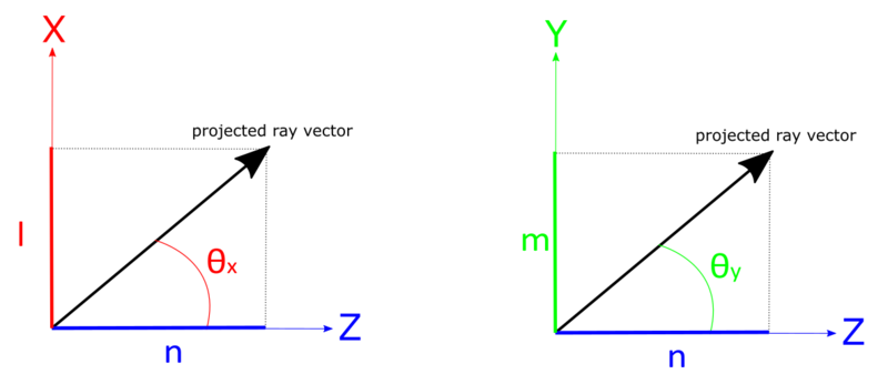 - θx is measured in the XZ plane as the angle the projected ray vector makes with respect to the z-axis. θx is an angle in degrees.