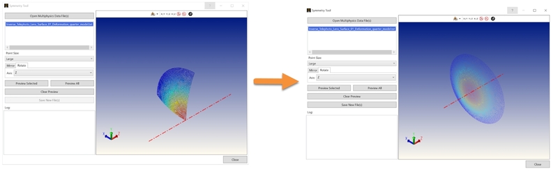 For FEA/CFD datasets that are saved with symmetric boundary conditions, the Symmetry Tool can be used to expand the FEA/CFD dataset to cover the full aperture of the surface and the expanded data can be saved to a new file. The new file can then be loaded with the Load FEA/CFD Data tool.