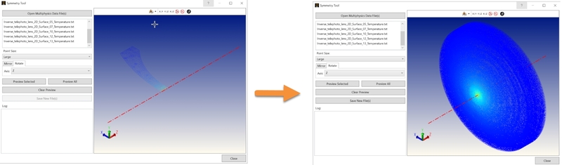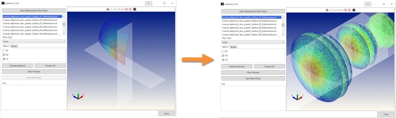Preview All: The Symmetry Tool will calculate and display the extrapolated FEA/CFD datapoints of all selected FEA/CFD datasets. Use this tool to verify that the enabled transformation settings are yielding the expected results for all of the FEA/CFD datasets prior to saving new FEA/CFD files.