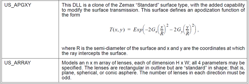 | US_STAND | This DLL is clone of the Zemax "Standard" surface type. This is the simplest DLL surface and is a good place to start the study of UDS DLL’s |